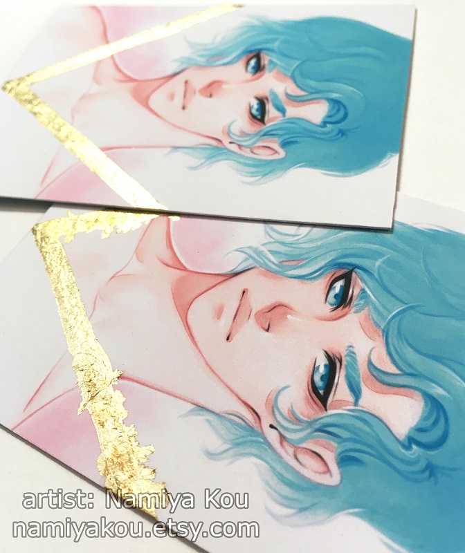 ACEO Print showing a beautiful, blue haired manga character, and a hand-embellished gold leaf shape across!