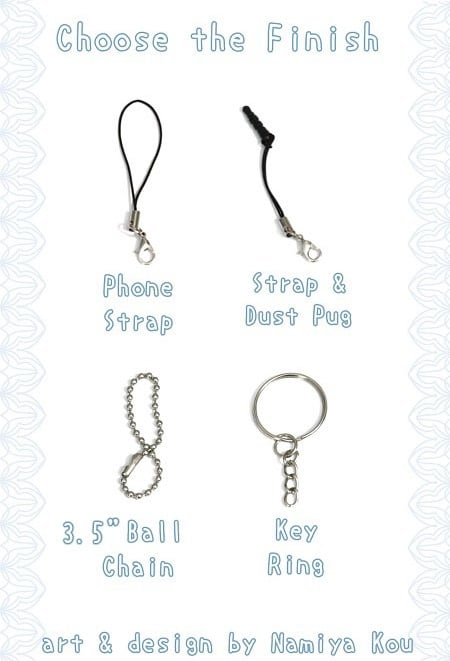 You can choose which finish you get for your charm: key chain, phone strap, phone strap with dust plug, or ball chain.