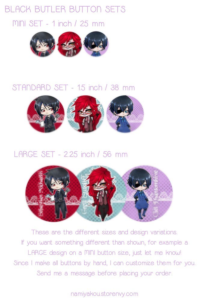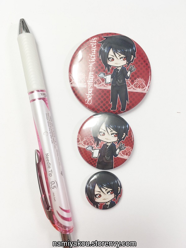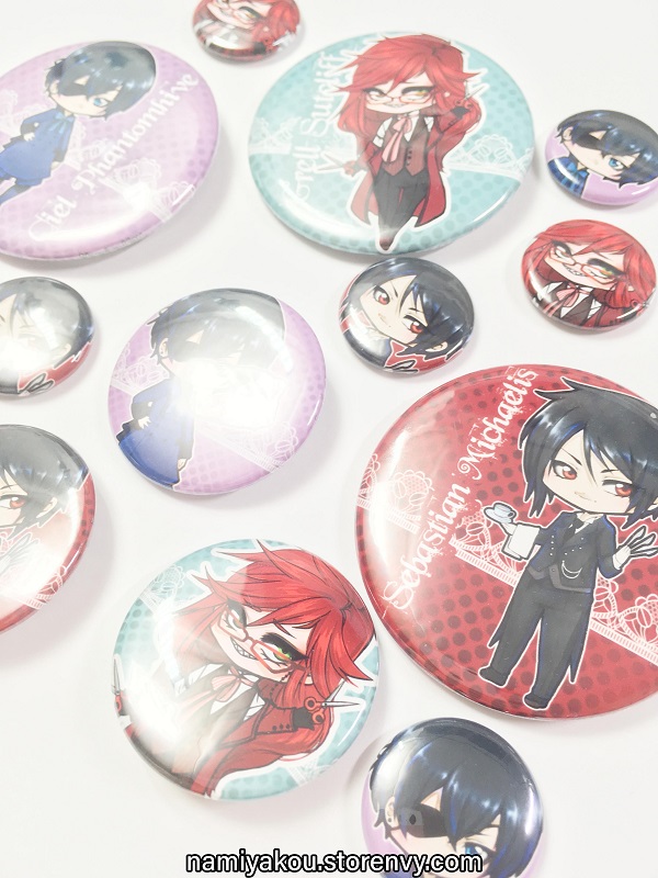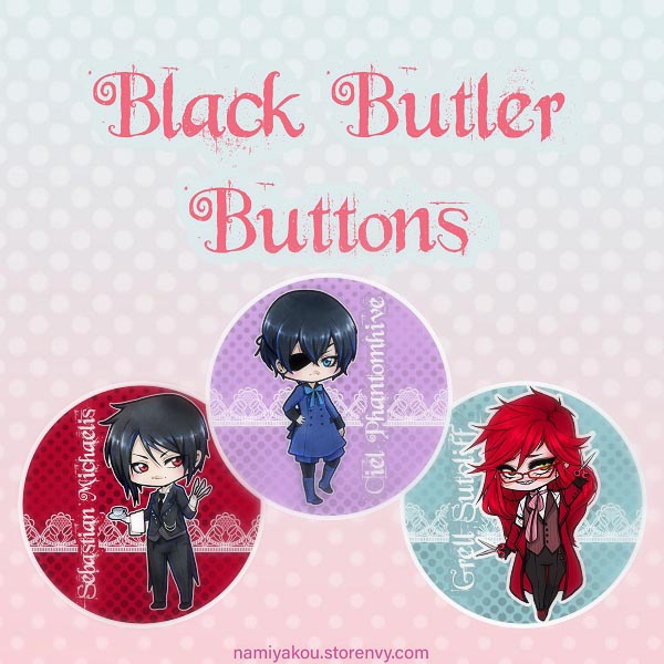 Cute Black Butler pins showing Ciel, Sebastian, and Grell!
