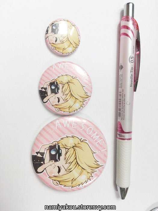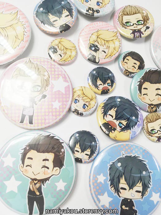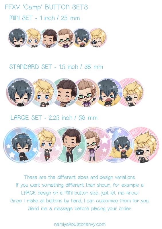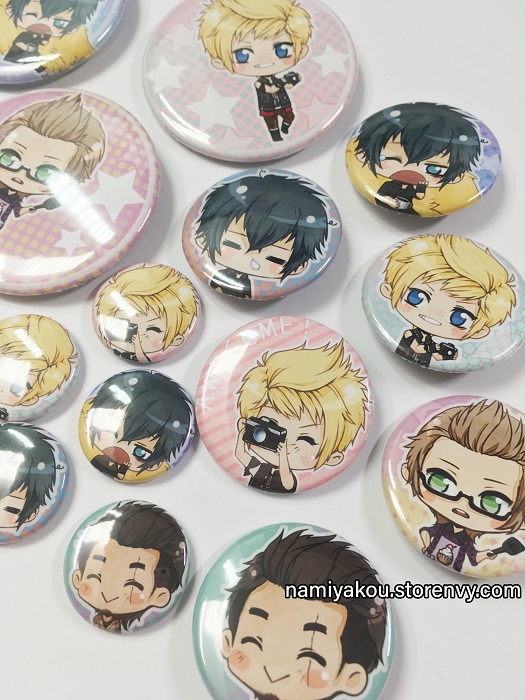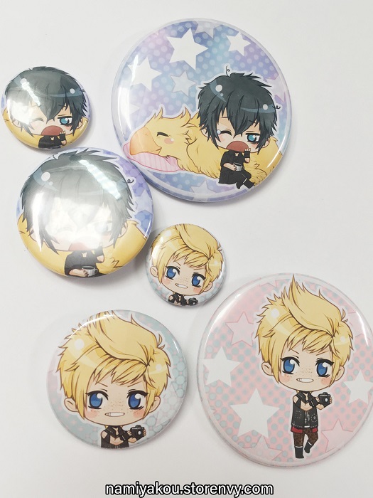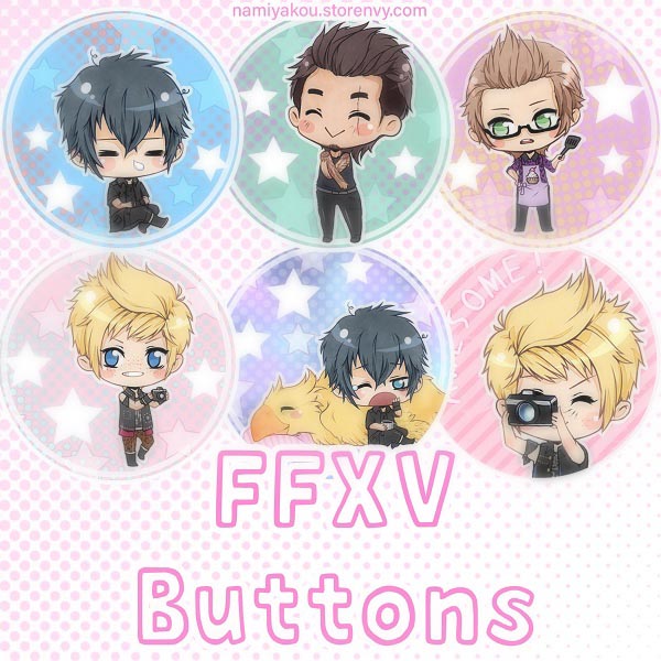 Adorable pastel colored FFXV buttons showing chibi versions of Noctis, Prompto, Gladio, and Ignis! There's also 2 more buttons of Noctis sleeping beside a Chocobo and Prompto taking photos!