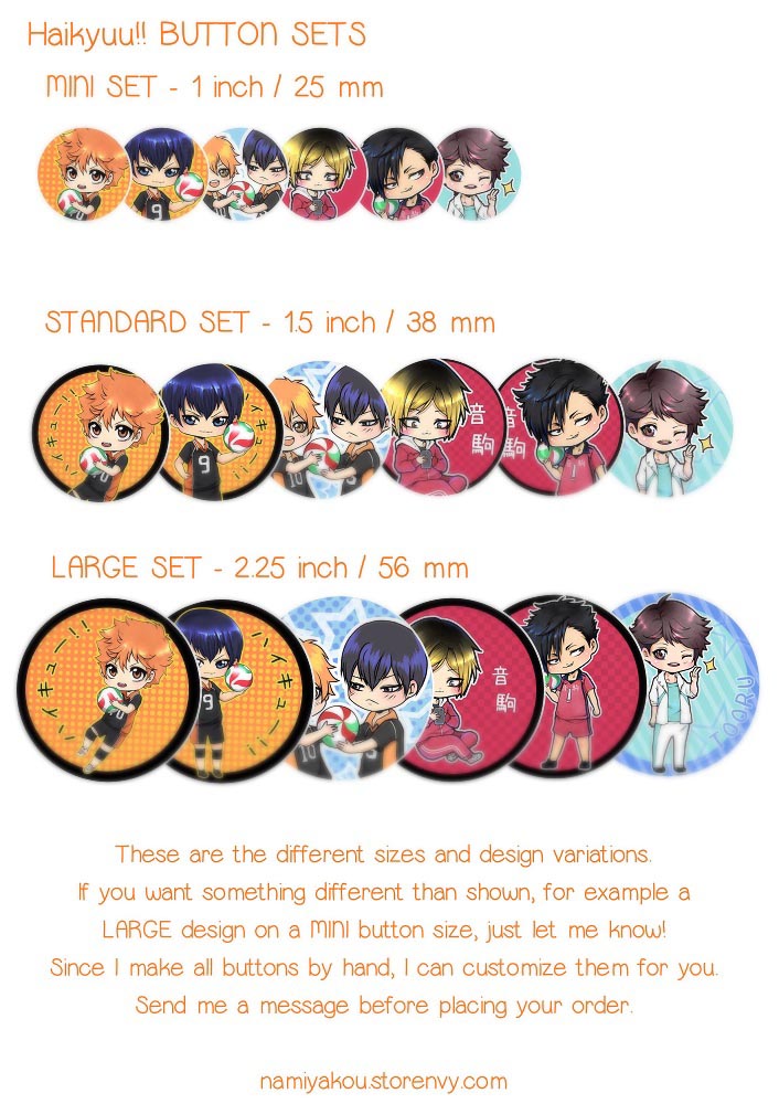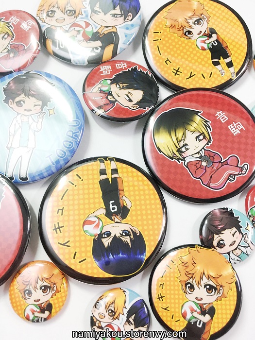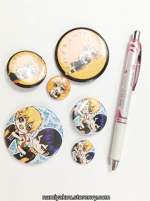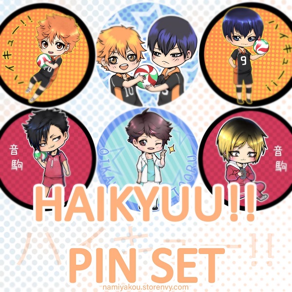 Cute Haikyuu pin sets with a total of 6 buttons: Kageyama, Hinata, Oikawa, Kuroo, Kenma, and a Kagehina one.