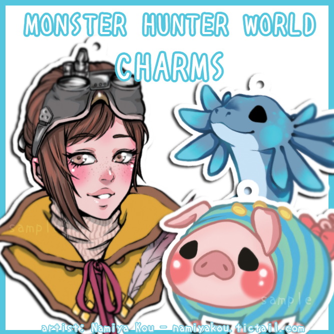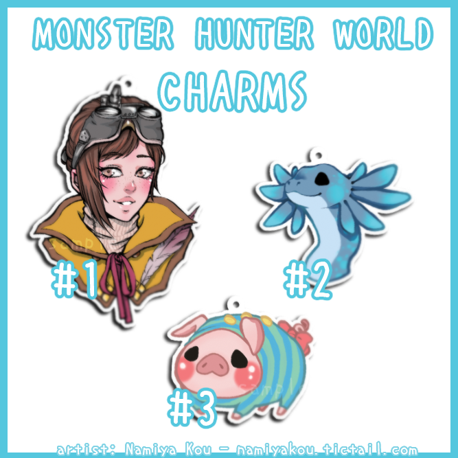 Single sided acrylic charms featuring the handler, Poogie and the wiggler from Monster Hunter World.