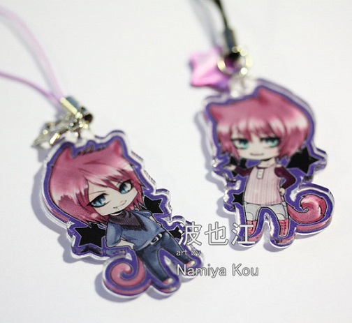 Professionally printed acrylic clear charms showing my original catboy characters Miki and his big brother Ranmaru!