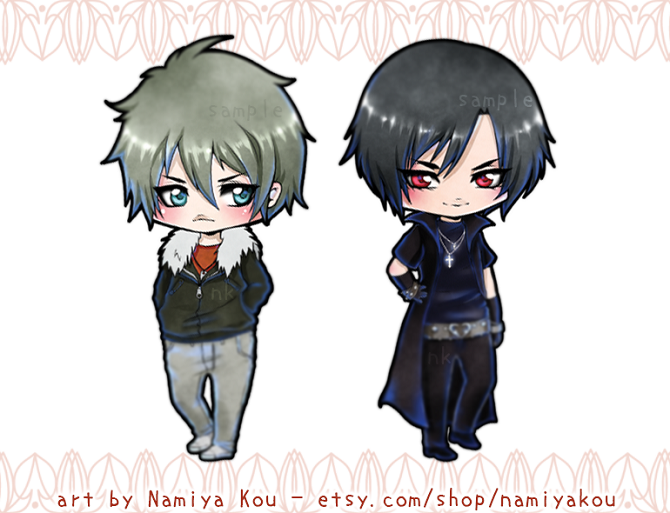 Cute acrylic charms showing Akira and Shiki from Togainu no Chi!