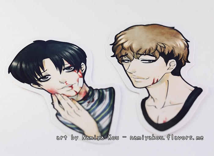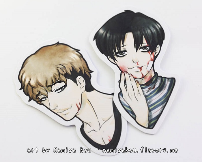 Stickers showing Sangwoo and Yoon Bum from Killing Stalking! They are on glossy adhesive paper and about 2.7" (7 cm) tall!