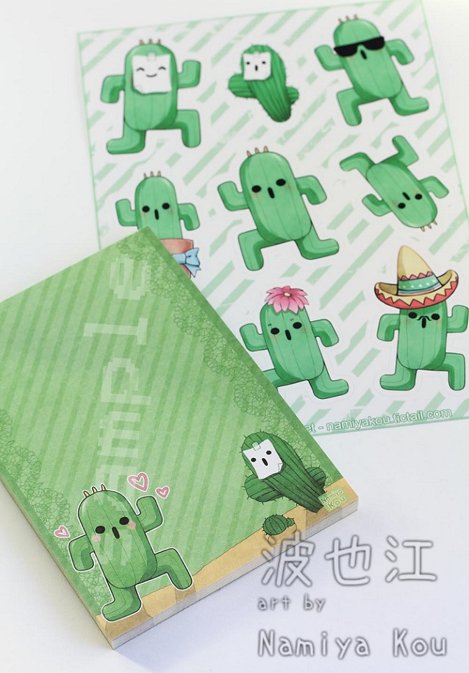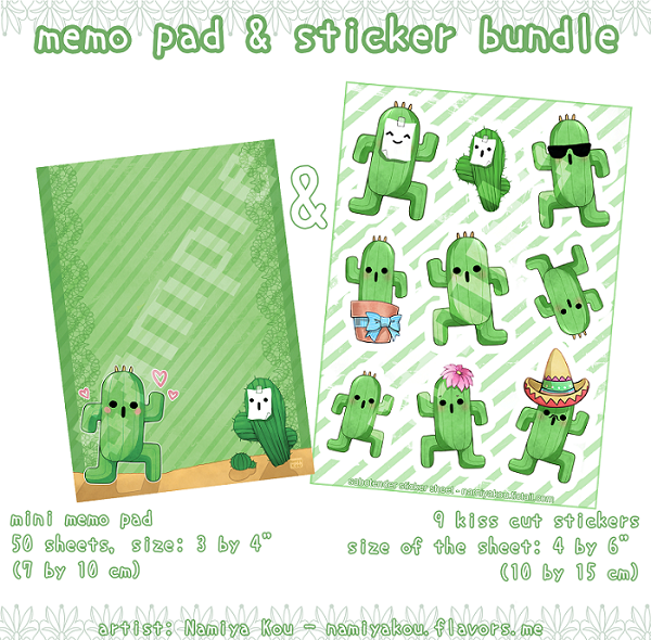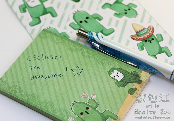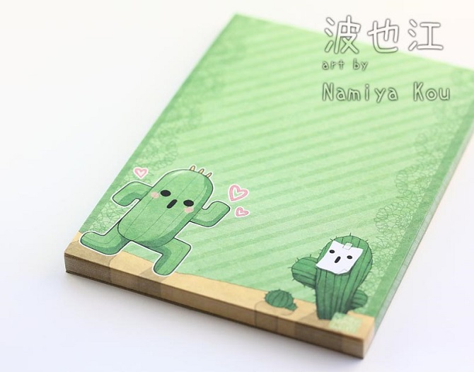 Mini memo pad about 3 by 4 inches in size (A7) with 50 sheets of paper that is printed on the front with the same design of a cute cactuar in love!