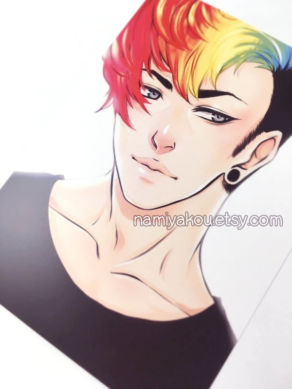 Print of my artwork 'Rainbow' showing a cute guy with rainbow hair.