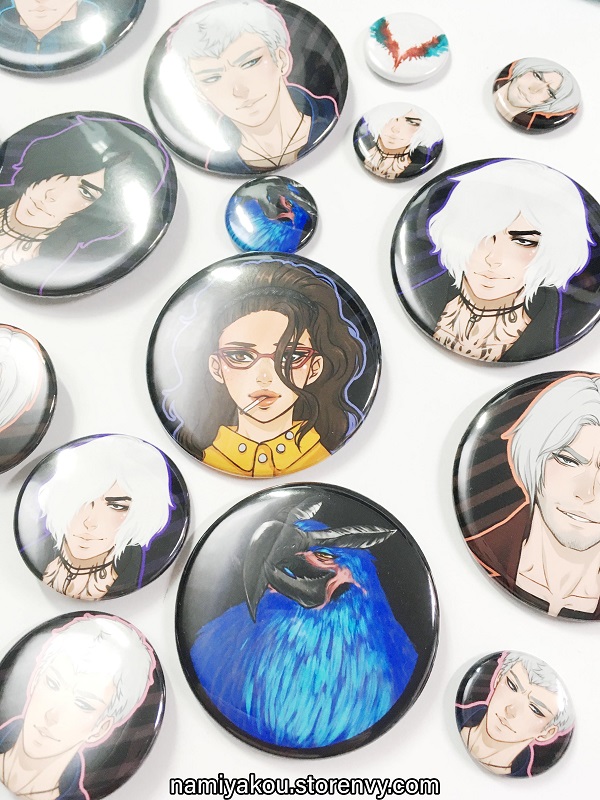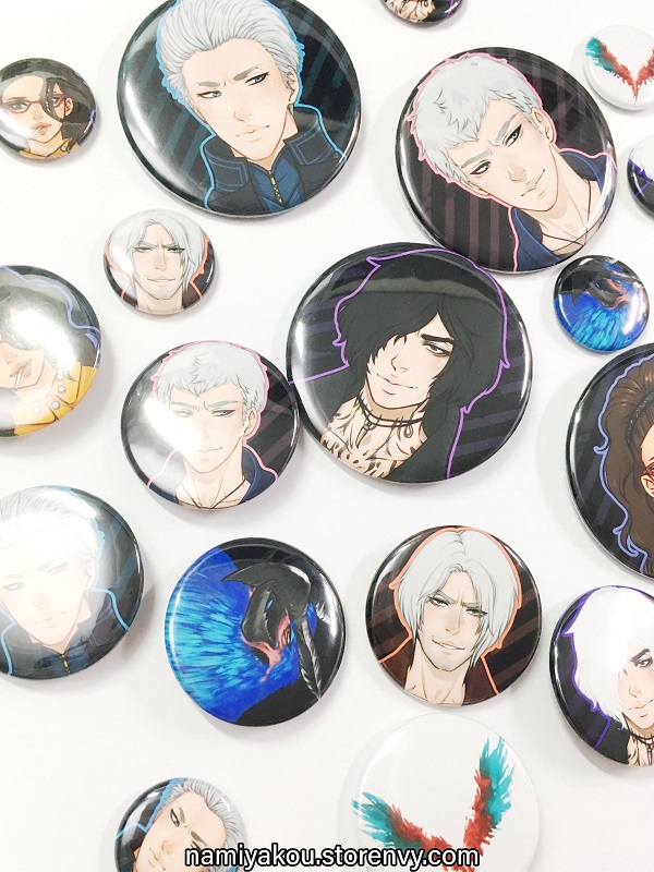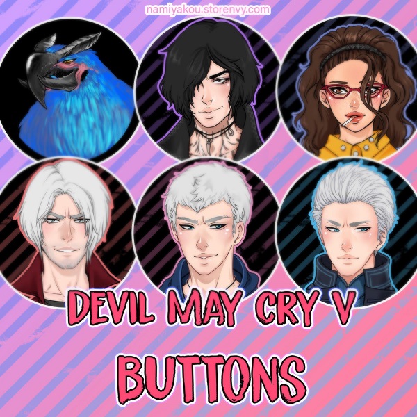 Devil May Cry Pin set including a total of 7 buttons showing Dante, Nero, Virgil, V, Nico and Griffon as well as the logo!