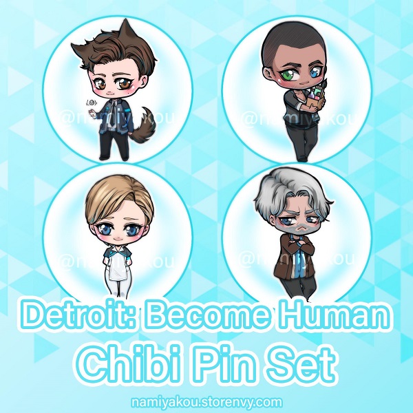 Detroit: Become Human chibi buttons! There's 4 different designs showing Kara, Connor, Markus, and Hank.