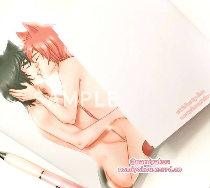 Notebook with my artwork "Lovers" showing to catboys kissing.